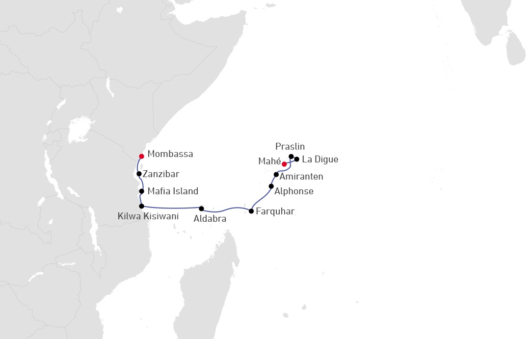 Welkom aan boord van deze 13-daagse cruise door de schilderachtige Seychellen en de Indische Oceaan. We vertrekken vanuit Mombassa naar de archipel van Zanzibar. Van daaruit gaan we eilandhoppen naar het ongelooflijk diverse Mafia Island, het eiland Kilwa Kisiwani dat op de Werelderfgoedlijst van UNESCO staat en dan genieten van tijd op zee voordat we de Seychellen verkennen. Ontdek de wilde, ongerepte schoonheid van afgelegen eilanden en atollen, vaar dan naar Praslin, het op een na grootste eiland van de Seychellen, voordat we de reis afsluiten op het eiland Mahé.